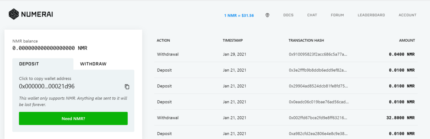 入金(deposit):ウォレットに登録されているアドレスにNMRトークンを送ることで入金できます。このアドレスに他のトークンを送ることはできません。