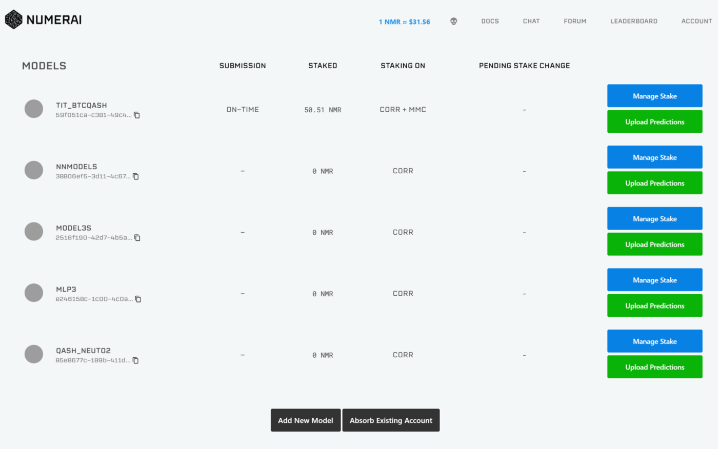 モデル このページでは、Numeraiに投稿するモデルを追加/削除できます。モデルの追加/削除をするには、「新しいモデルの追加」/「既存のアカウントの吸収」を押してください。 複数モデルのアカウントやアカウントの吸収についてはこちらをご覧ください。
